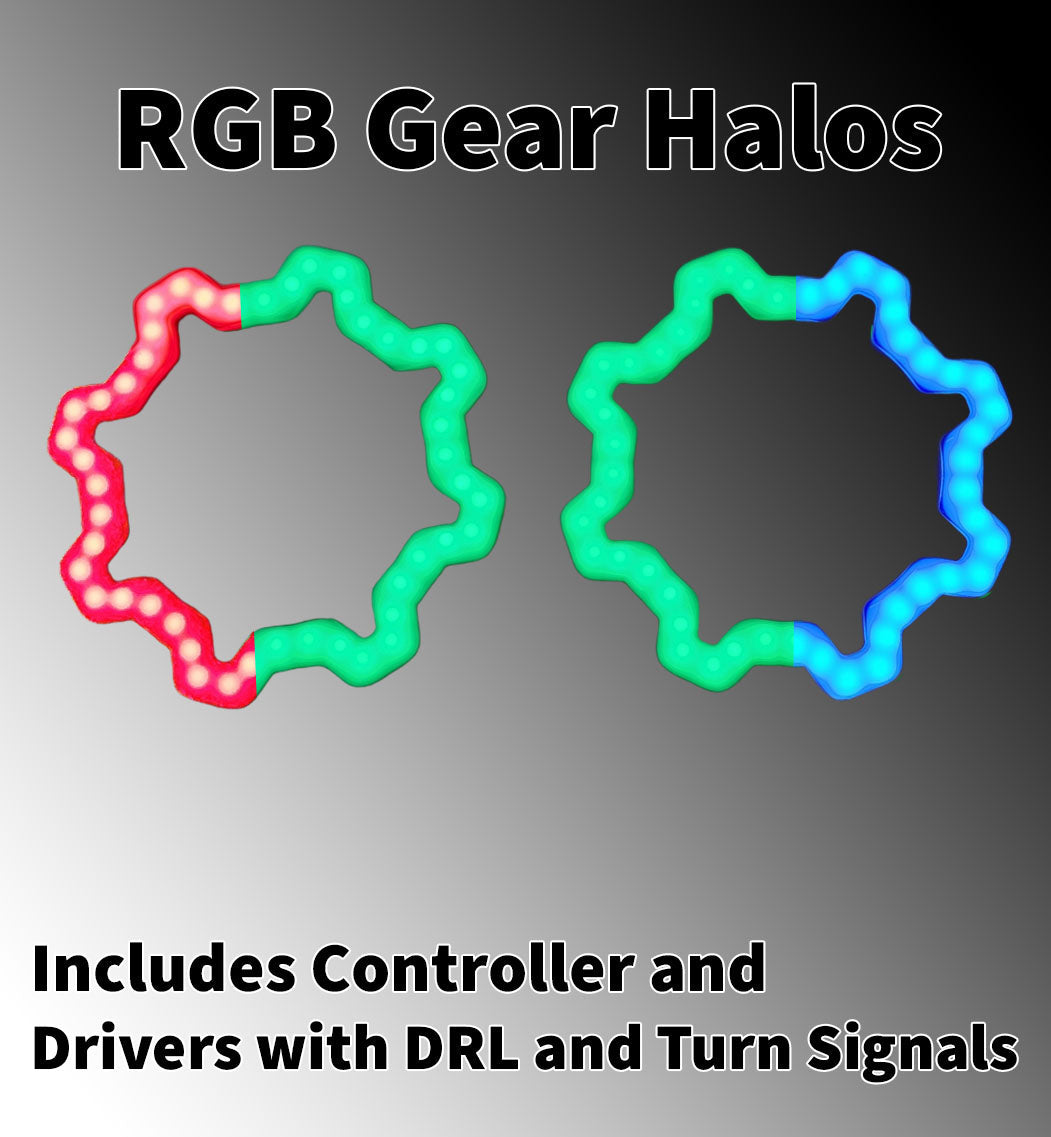 - Each set of Gear RGB Halos comes with our user-friendly RGB halo drivers, featuring inputs for both Daytime Running Lights (DRL) and Turn signals. This level of control allows for seamless integration with your vehicle's lighting system.
